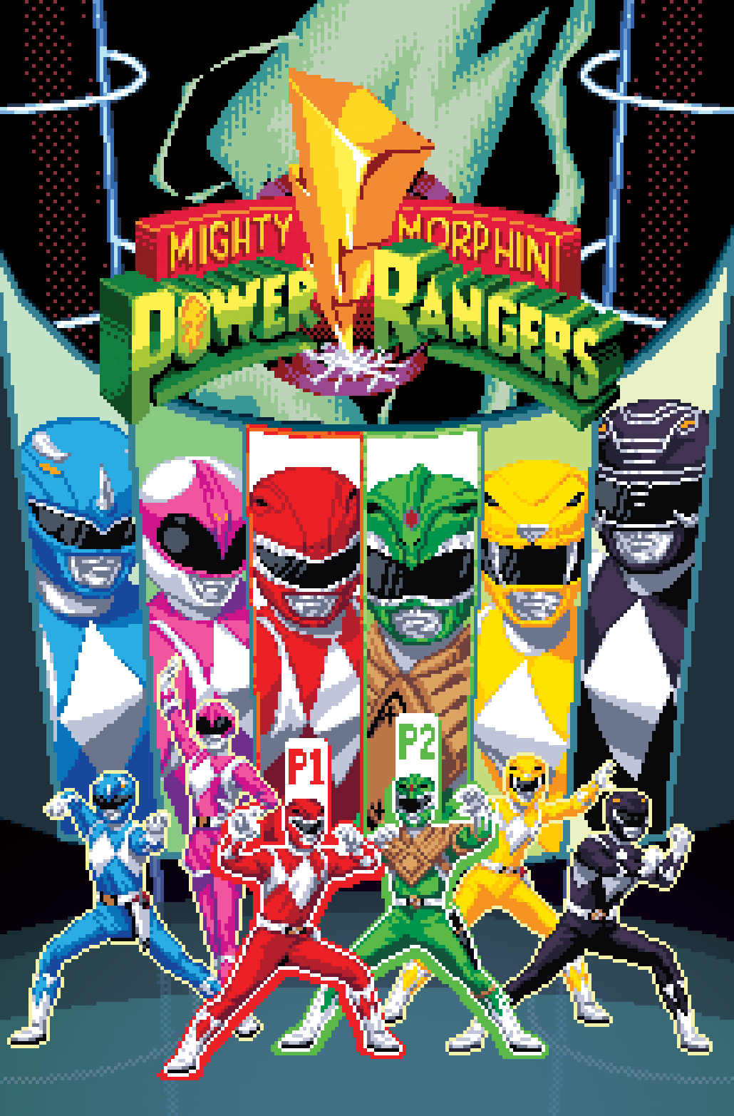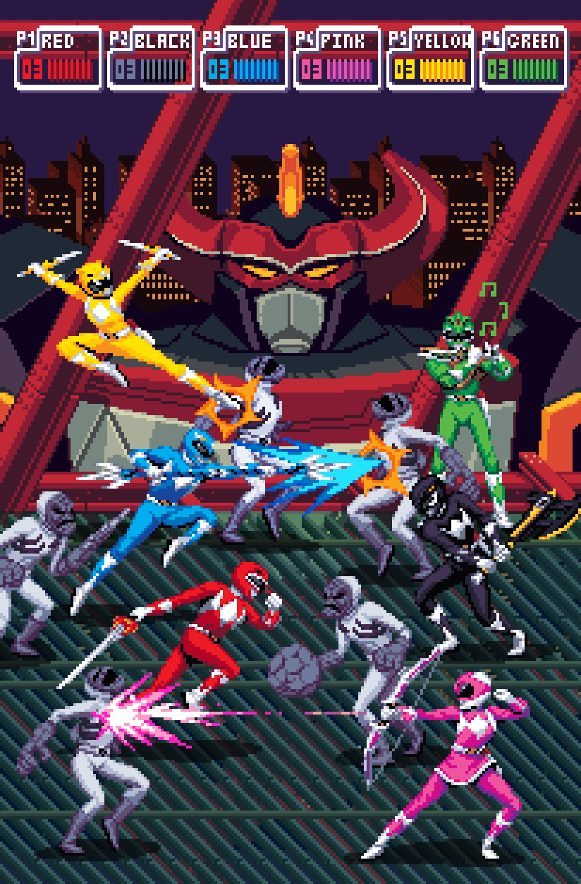 Cover for the Teenage Mutant Ninja Turtles x Power Rangers crossover comic book. The idea was to make the first level of Turtles in Time as a Power Rangers Game.